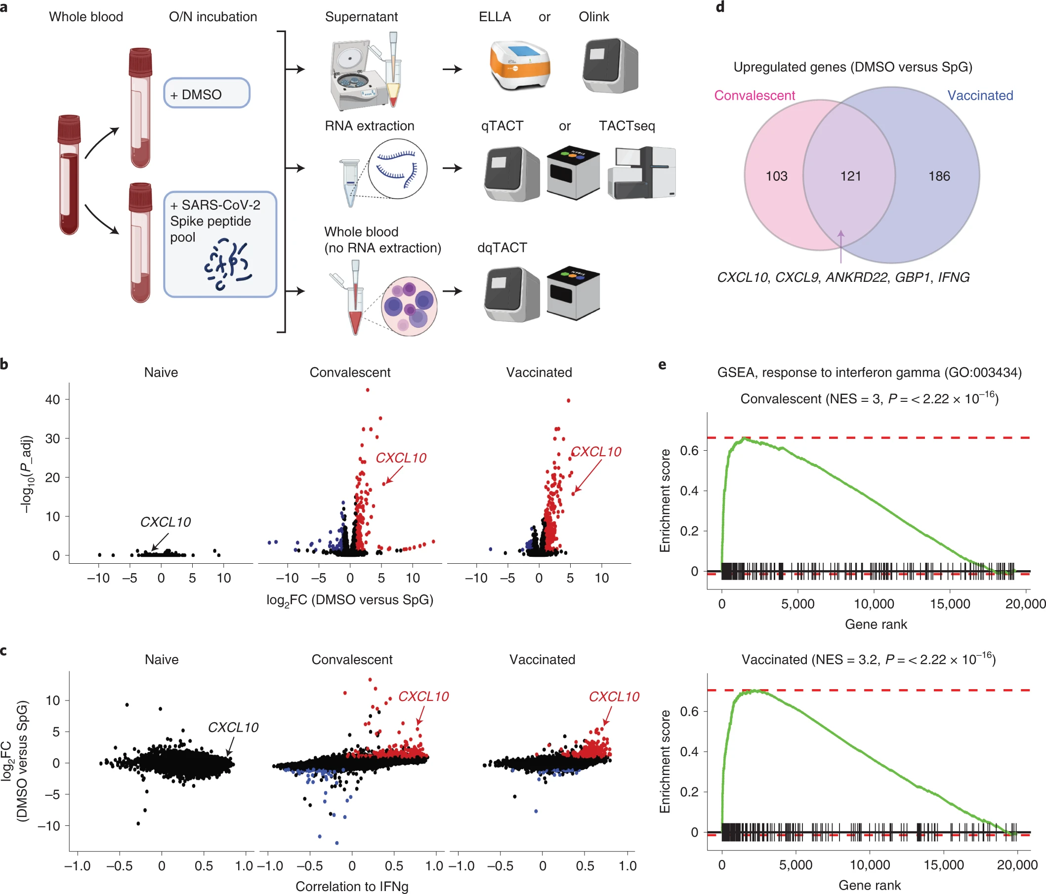 a, T細胞活性化アッセイのワークフロー概略図。すべてのアッセイは、全血採取から始まり、DMSO、ヌクレオカプシド(NP)、またはSpGペプチドプールで一晩刺激する。次に、上清を ELLA または Olink で回収し、RNA を抽出してプローブベースの qPCR(qTACT)または次世代シーケンサー(TACTseq)に使用するか、全血を希釈して直接 qPCR(dqTACT)に使用します。b, 全血のスパイクペプチドプール活性化に反応して CXCL10 がアップレギュレートされる。スパイクペプチドプール対DMSOで刺激された差次的発現遺伝子を、参加者のCOVID-19またはワクチン接種の状態によってグループ化し、赤(発現増加)または青(発現減少)として表示したボルケーノプロット。有意に差次的に発現した遺伝子は、調整P値<0.05および|log2FC|>1を有するものとして定義された。P値はDESeq2(両側)を用いて計算し、Benjamini-Hochberg法を用いて調整した。 c, CXCL10とIFNG mRNA誘導は相関する。サンプルにわたるIFNG発現に対する各遺伝子の相関(x軸)、及びスパイクペプチドプール対DMSOの対応するlog2FC(DESeq2により算出)を、COVID-19又はワクチン接種の状態によりグループ化して表示する散布図。d、DMSO対照サンプルと比較したスパイクペプチド刺激サンプルについて、回復期およびワクチン接種期参加者における有意に上昇した遺伝子の重複を表示したベン図。e, COVID-19回復者及びワクチン接種者コホートにおいて、DMSO対照サンプルと比較したスパイクペプチド刺激サンプルで発現した遺伝子のうち、IFN-γ応答遺伝子について有意に正の濃縮を示すGSEAプロット。