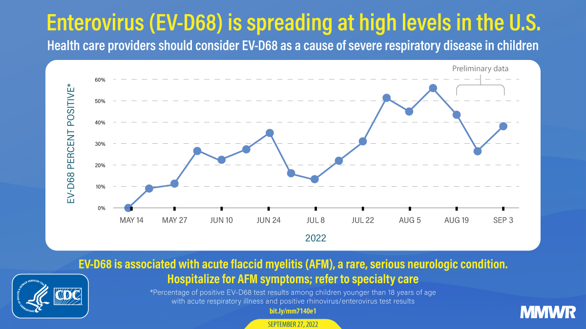 エンテロウイルスD68(EV-D68)感染に起因する小児および青年における重篤な呼吸器疾患および急性弛緩性脊髄炎(AFM)の増加は、主に晩夏および秋に、2014年、2016年、および2018年に2年に1度にわたって米国で発生した。EV-D68の年間傾向は完全には理解されていませんが、EV-D68のレベルは、COVID-19緩和措置(フェイスマスクの着用、手指衛生の強化、身体的距離など)の実施により、2020年の予想よりも低かった(1)。2022年8月、いくつかの地域の臨床医はCDCに、重篤な呼吸器疾患および陽性のライノウイルス/エンテロウイルス(RV/EV)検査結果を有する小児患者の入院の増加を通知しました*急性呼吸器疾患(ARI)、喘息/反応性気道疾患(RAD)の悪化の報告された傾向、および2022年中のRV/EVおよびEV-D68検査結果陽性の割合を前回と比較して特徴付けるために、複数の国内データソースからサーベイランスデータを分析しました。 月日。これらのデータは、2022年夏の終わりに、ARIおよび喘息/RADを有する小児および青年による救急部門(ED)訪問の増加を示した。この間、国立研究所ベースのサーベイランスにおけるRV/EV検査結果陽性の割合と小児センチネルサーベイランスにおけるEV-D68検査結果陽性の割合も増加しました。EV-D68呼吸器疾患の以前の増加は、いくつかの病院でかなりの資源需要をもたらし、脊髄に影響を及ぼす稀ではあるが深刻な神経学的疾患であるAFM(2)の症例の増加とも一致している。したがって、臨床医は、急性弛緩性四肢衰弱の患者、特に呼吸器疾患または発熱後のAFMを検討し、そのような症例に対する迅速な入院および専門ケアへの紹介を確実にすべきである。臨床医はまた、ポリオウイルスによって引き起こされる急性弛緩性麻痺との臨床的類似性のために、AFMを有する疑いのある患者におけるポリオウイルス感染について検査すべきである。EV-D68の継続的な監視は、ARIとAFMの将来の増加の可能性に対する準備を確実にするために不可欠です。
