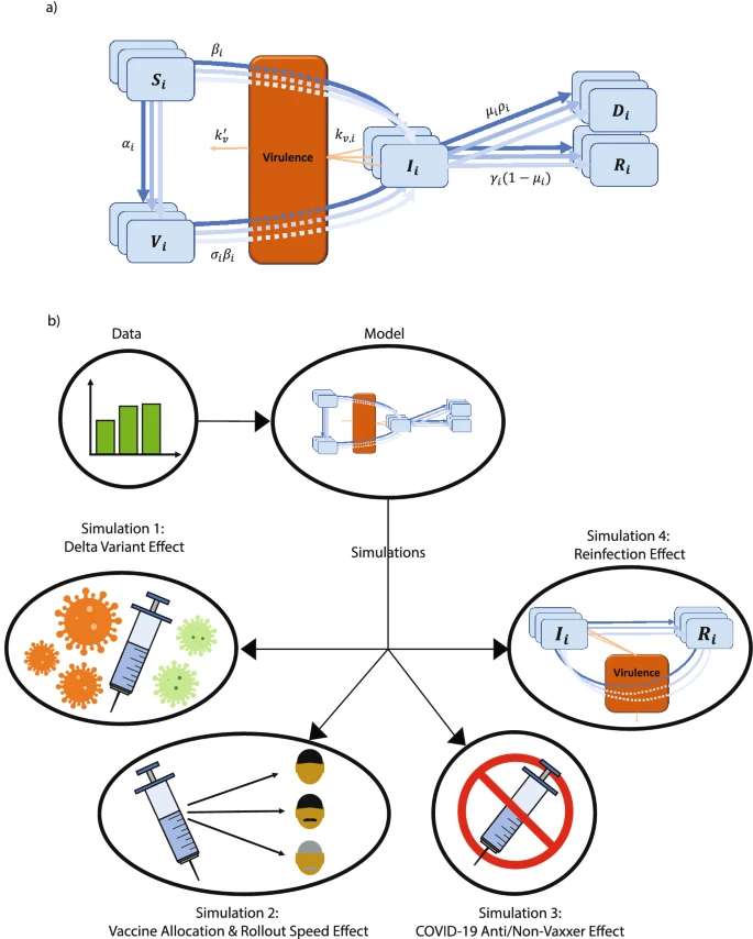 この研究では、3つの異なる年齢層におけるCOVID-19感染と死亡を予測するための新しいコンパートメントモデルを開発。年齢層内および年齢層間の相互作用をシミュレートするために、このモデルは病原性環境によってもたらされる感染を使用、人口収支方程式を使用して導出.まず、このモデルを 2021 年 1 月から 7 月までの COVID-19 の症例、死亡、ワクチン接種のデータに適合。次に、適合モデルを使用して、図1bに示すように、4つのシミュレーションに焦点を当てて、2021年8月から予測。